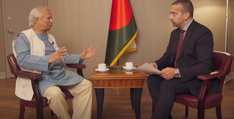 হিন্দুসহ সংখ্যালঘু সম্প্রদায়ের বিরুদ্ধে ক্রমবর্ধমান সহিংসতার খবরে প্রথমেই চাপের মুখে পড়ে অন্তর্বর্তী সরকার। গত নভেম্বরে হাজার হাজার হিন্দুর বিক্ষোভ এবং মার্কিন প্রেসিডেন্ট ডনাল্ড ট্রাম্পসহ বিশ্বব্যাপী ব্যক্তিত্বদের সমালোচনার জবাবে ইউনূস সেসব দাবিগুলোকে ভুয়া খবর বলে উড়িয়ে দিয়েছেন। তিনি ভারতকে ভুল তথ্য ছড়ানোর জন্য অভিযুক্ত করেছেন। সম্প্রদায়ের (হিন্দু-মুসলিম) মধ্যে একটি স্বাভাবিক সম্পর্ক রয়েছে। কখনও কখনও জমি বা পাড়ার দ্বন্দ্ব থাকে। কিন্তু পদ্ধতিগত হিন্দু-বিরোধী সহিংসতার ধারণাটি অতিরঞ্জিত বলে মন্তব্য করেন ইউনূস। সমালোচনা সত্ত্বেও জোর দিয়ে তিনি বলেন, বিশ্বাসযোগ্য নির্বাচন নিশ্চিত করতে এবং কয়েক দশক ধরে বাংলাদেশকে জর্জরিত করা কর্তৃত্ববাদী রাজনৈতিক চক্রের পুনরাবৃত্তি রোধে আওয়ামী লীগের কার্যক্রম সাময়িক স্থগিতাদেশ প্রয়োজনীয়। ইউনূস মার্কিন প্রেসিডেন্ট ডনাল্ড ট্রাম্প নোবেল শান্তি পুরস্কারের যোগ্য কিনা তা নিয়ে প্রশ্নগুলো কার্যত এড়িয়ে যান। তিনি বলেন, এটি নোবেল কমিটির বিষয়। তারা সিদ্ধান্ত নিবে। জবাবে মেহেদি হাসান অট্টহেসে বলেন, উত্তরটি খুব ভালো হয়েছে, খুব ভালো কূটনৈতিক উত্তর।