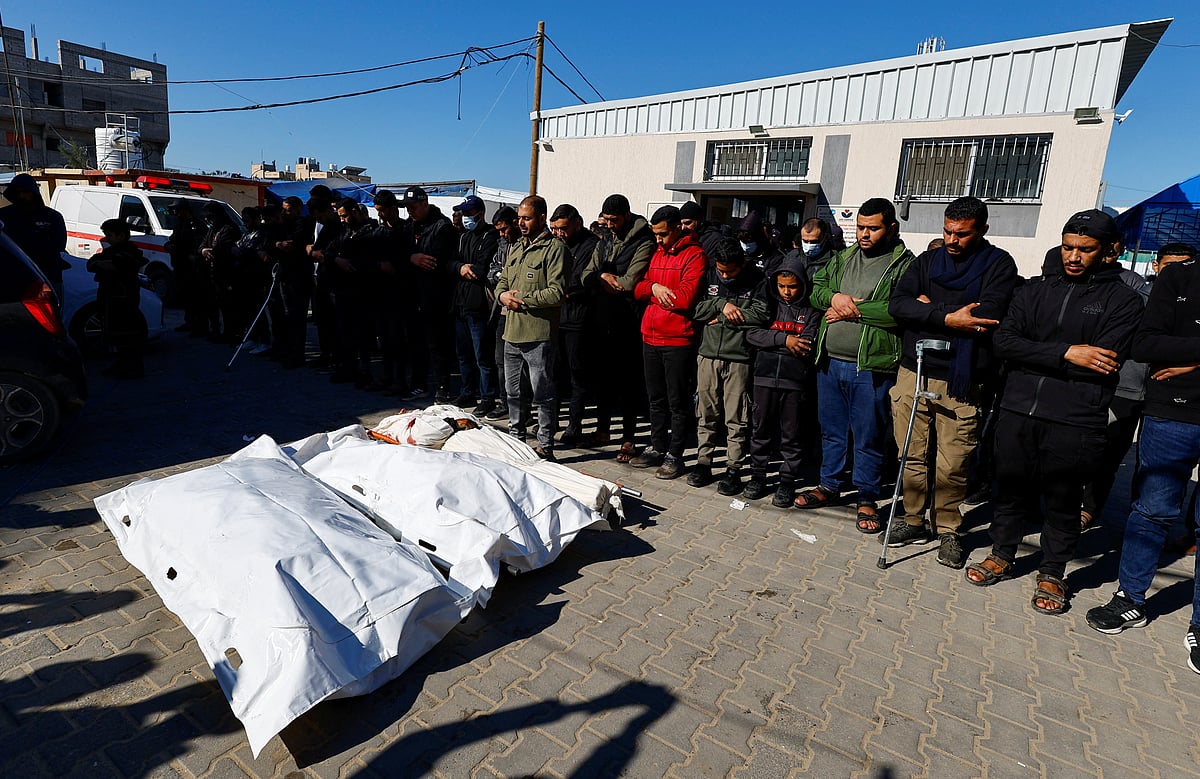 | ইসরায়েলি হামলায় নিহত ফিলিস্তিনিদের জানাজা অনুষ্ঠিত হয় দেইর আল–বালাহর আল–আকসা মার্টারস হাসপাতালে। ১৬ জানুয়ারি ২০২৬, মধ্য গাজা। ছবি: রয়টার্স |