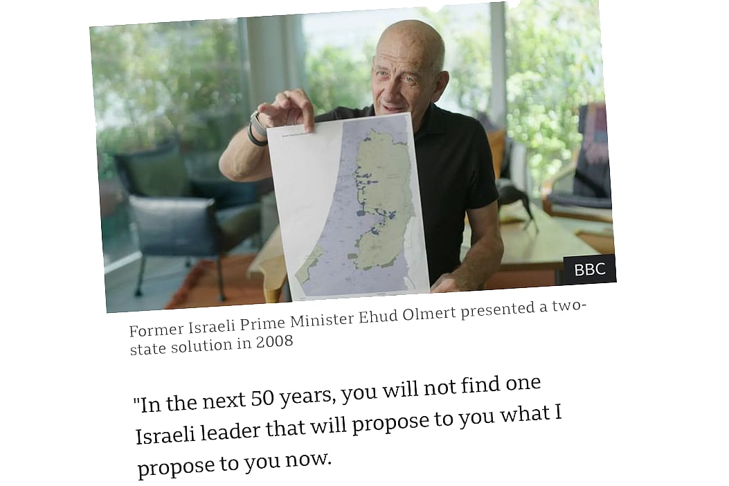 ওই তথ্যচিত্রে ওলমার্ট ২০০৮ সালের ১৬ সেপ্টেম্বর জেরুজালেমে এক বৈঠকে মাহমুদ আব্বাসের সামনে উপস্থাপন করেন। এত দিন পর সেই মানচিত্রটি তিনি প্রকাশ্যে আনলেন।