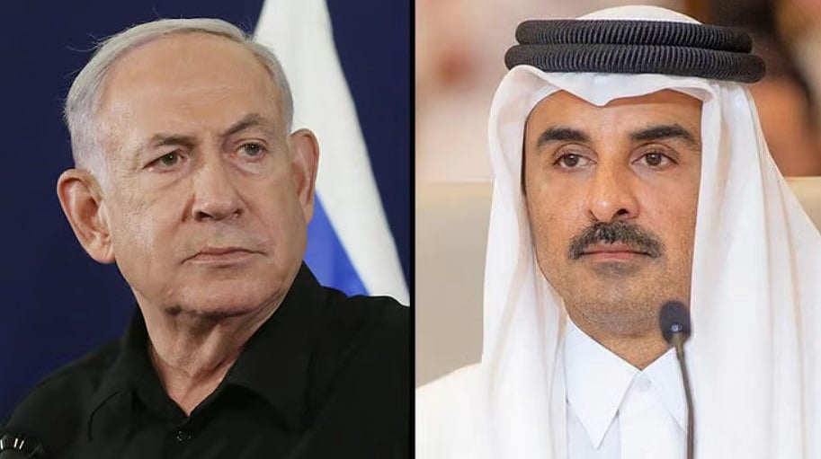 | ইসরায়েলের প্রধানমন্ত্রী বেনিয়ামিন নেতানিয়াহু এবং কাতারের আমির তামিম বিন হামাদ আলে সানি। ছবি: রয়টার্স |