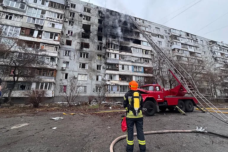 | ইউক্রেনের জাপোরিঝঝিয়ায় রাশিয়ার হামলায় একটি ভবনে আগুন ধরে যায়। ফায়ার সার্ভিসের কর্মীরা আগুন নিয়ন্ত্রণে কাজ করছেন। ১৬ ডিসেম্বর। ছবি: এএফপি |