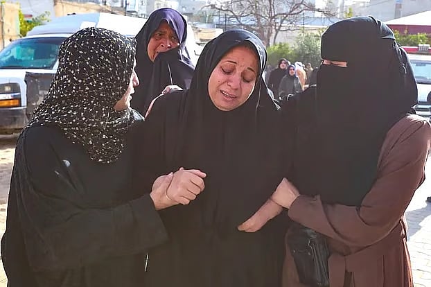 | গাজার খান ইউনিস এলাকায় নাসের হাসপাতালে ইসরায়েলি হামলায় নিহত ফিলিস্তিনিদের জানাজায় স্বজনেরা কান্নায় ভেঙে পড়েন। ১৫ ফেব্রুয়ারি ২০২৬ ছবি: রয়টার্স |