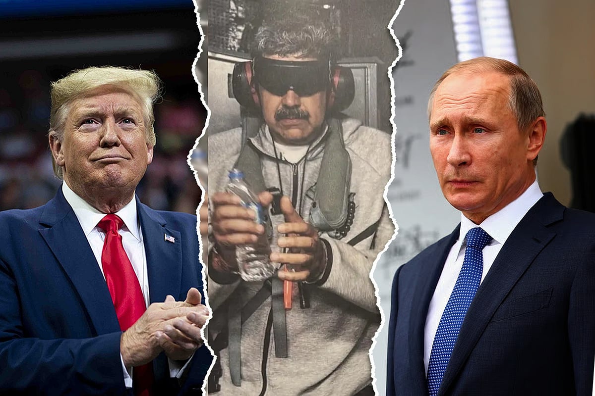 | ডোনাল্ড ট্রাম্প, বন্দী নিকোলা মাদুরো ও ভ্লাদিমির পুতিন। কোলাজ: প্রথম আলো |