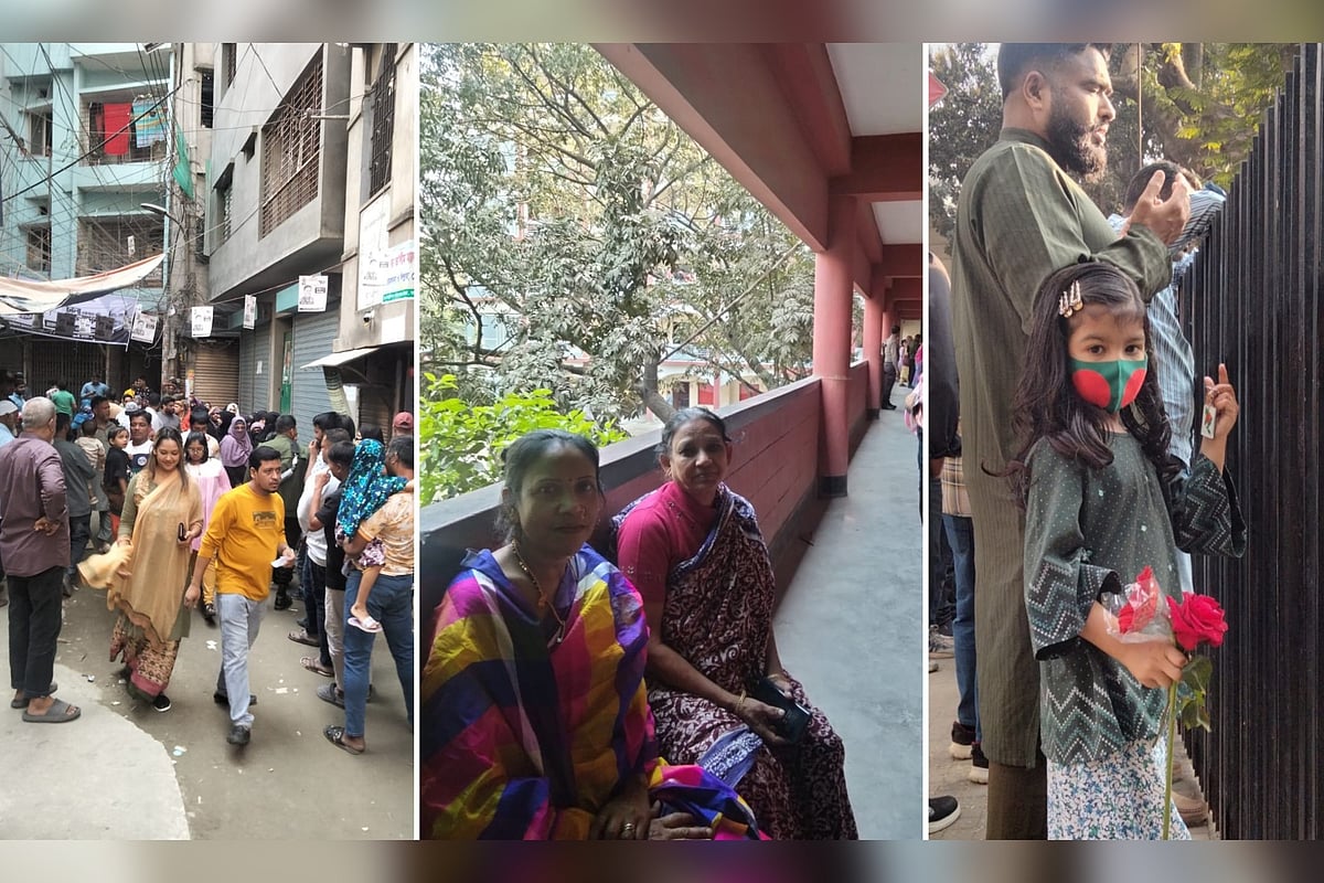 | পুরান ঢাকার গলিতে ভোটকেন্দ্রে ভিড়। আরেক কেন্দ্রে বসে আছেন সরস্বতী ও চান্দা রানী। শহীদ ওসমান হাদির কবর জিয়ারত করছেন হাসিবুল হাসান। ছবি: লেখকের সৌজন্যে |